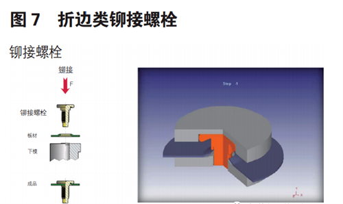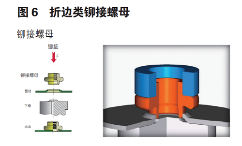 二、折邊類(lèi)互鎖壓鉚標(biāo)準(zhǔn)件主要是通過(guò)標(biāo) 準(zhǔn)件底部的翻邊結(jié)構(gòu)與開(kāi)孔板材面在壓頭作用下,固有模具下擠壓翻邊折彎成型互相嵌套,形成互鎖結(jié)構(gòu),完成標(biāo)準(zhǔn)件與板材的連接。其結(jié)構(gòu)形式如下圖 6 和圖 7 所示。