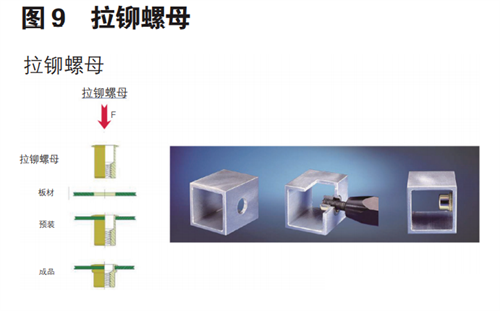拉鉚是通過(guò)標(biāo)準(zhǔn)件頭部拉壓變形膨脹,與端部法蘭面上下夾住板材開(kāi)孔,形成一種穩(wěn)定可靠的標(biāo)準(zhǔn)件連接形式。用于各類(lèi)金屬板材、管材等制造工業(yè)的緊固領(lǐng)域;在鋁車(chē)身上應(yīng)用廣泛。其結(jié)構(gòu)形式如下圖 9、圖 10 所示。