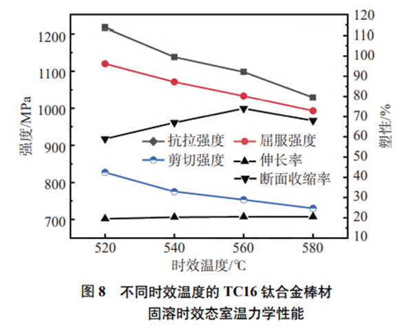 圖8為時(shí)效溫度對TC16鈦合金棒材固溶時(shí)效態(tài)室溫力學(xué)性能的影響,由圖8可以看出,隨著時(shí)效溫度的升高,棒材的抗拉強(qiáng)度、屈服強(qiáng)度、剪切強(qiáng)度逐漸降低,伸長率逐漸升高,斷面收縮率先升高 后降低。