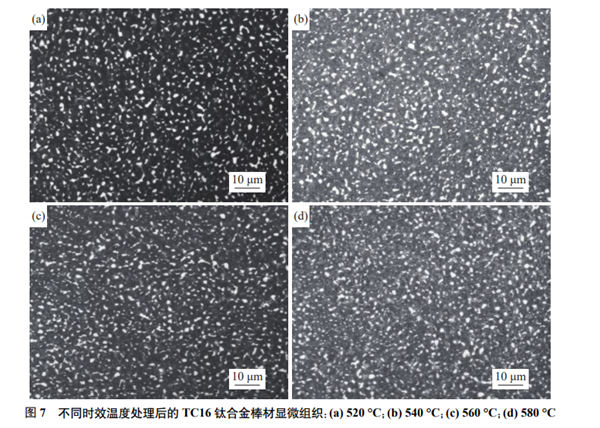 圖7所示為不同時(shí)效溫度固溶時(shí)效處理后的TC16鈦合金棒材顯微組織,由圖7可以看出,隨著時(shí)效溫度升高,固溶過程中保留的亞穩(wěn)定β相轉(zhuǎn)變而形成的質(zhì)點(diǎn)的彌散程度也各不相同,520 °C時(shí)效從亞穩(wěn)定β相分解的第二相比較彌散,如圖7(a) 所 示。隨著時(shí)效溫度的升高,彌散析出的第二相質(zhì)點(diǎn)開始聚集,如圖7(c) 和7(d) 所示,研究表明TC16 鈦合金亞穩(wěn)定相分解從350~400 °C開始,500 °C 時(shí)效后亞穩(wěn)定β相完全分解,但穩(wěn)定化β相的鉬、 釩含量比在較低溫度下得到平衡的β相的少[1]。