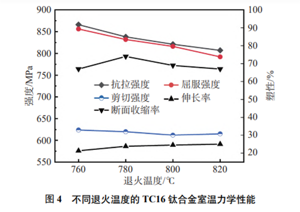 圖4為不同退火溫度對TC16鈦合金棒材室溫性能的影響。