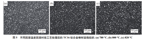 圖5為不同固溶溫度固溶時(shí)效處理后的TC16鈦合金棒材顯微組織,圖中白色顆粒為初生α相,黑色部分為β基體(包括淬火保留下來的亞穩(wěn)定β相和α′′相)。