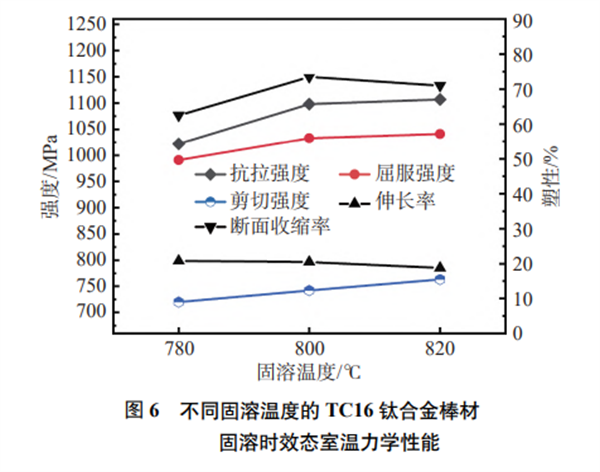 圖6所示為不同固溶溫度固溶時(shí)效處理后的TC16鈦合金棒材室溫力學(xué)性能,可以看出,隨著固溶溫度升高,棒材固溶時(shí)效態(tài)的抗拉強(qiáng)度、屈服強(qiáng)度、剪切強(qiáng)度均升高,伸長率降低,斷面收縮率先 升高再降低。在800 °C時(shí)棒材斷面收縮率達(dá)到了最高值 74%,抗拉強(qiáng)度達(dá)到了1098 MPa,剪切強(qiáng)度達(dá)758MPa,強(qiáng)度與塑性達(dá)到了最佳匹配,故TC16鈦合金棒材的最佳固溶制度為 800 °C保溫2 h, 水淬。