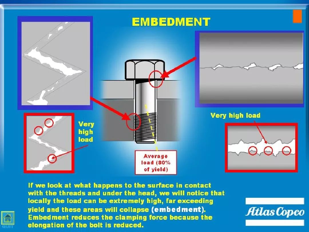 螺栓:機(jī)械零件,配用螺母的圓柱形帶螺紋的緊固件。由頭部和螺桿(帶有外螺紋的圓柱體)兩部分組成的一類緊固件,需與螺母配合,用于緊固連接兩個(gè)帶有通孔的零件。這種連接形式稱螺栓連接。如把螺母從螺栓上旋下,又可以使這兩個(gè)零件分開(kāi),故螺栓連接是屬于可拆卸連接。下面我們就來(lái)講講,關(guān)于螺栓擰緊技術(shù)!擰緊一顆螺栓,需要施加一定扭矩旋轉(zhuǎn)一定角度后才可以完成,這部分的扭矩+角度所做功最終轉(zhuǎn)為三個(gè)部分:? Fm= T/ (0.16P + (μg * 0.58 * d2) + ((Dkm/2) * μk))μg = 螺紋副摩擦系數(shù)friction value in threadDkm = 螺栓頭表面尺寸 size of surface bolt (nut)-headμk = 螺栓頭表面摩擦系數(shù)fricition value surface bolt-head一般而言,這三者的比例在10%,40%以及50%,這部分能量的消耗很容易直觀的體會(huì)到:10%的夾緊力做功體現(xiàn)在螺栓的被拉伸,40%和50%體現(xiàn)了螺紋副以及螺栓頭下擰緊后摩擦力導(dǎo)致的發(fā)熱。螺栓的初始設(shè)計(jì)是按照如上圖的比例來(lái)分配三者關(guān)系的,如果實(shí)際的過(guò)程中改變了三者的比例關(guān)系,會(huì)出現(xiàn)扭矩“合格”,夾緊力不合格的情況。此時(shí)螺紋副摩擦系數(shù)降低,摩擦力矩變小,施加的扭矩“轉(zhuǎn)移”給夾緊力,后果有可能是:螺栓拉斷或者工件變形。此時(shí)螺紋副摩擦系數(shù)增加,有可能扭矩合格后夾緊力不足。其它改變摩擦系數(shù)的常見(jiàn)情況有:涂層材料改變,涂層厚度變化,螺栓/螺釘公差,與螺帽旋轉(zhuǎn)接觸面摩擦系數(shù),工具轉(zhuǎn)速,墊片增加/減少等。螺栓擰緊是裝配環(huán)節(jié)的重要環(huán)節(jié),螺栓/螺母在產(chǎn)品壽命周期內(nèi)必須穩(wěn)定連接,否則有可能造成嚴(yán)重的質(zhì)量事故,因?yàn)槁菟?螺母失效而導(dǎo)致的安全事故時(shí)有發(fā)生。螺栓常見(jiàn)強(qiáng)度等級(jí)如下,如果螺栓制造商供應(yīng)的螺栓不能滿足對(duì)應(yīng)的強(qiáng)度要求,螺栓連接的安全性也無(wú)法得到保障。按照ISO898要求,與螺栓配合的螺紋副/螺母強(qiáng)度要與螺栓本身強(qiáng)度相匹配,比如螺栓強(qiáng)度為10.9的螺栓,應(yīng)采用強(qiáng)度為10的螺母。同樣根據(jù)ISO898要求,螺母或者有效螺紋連接高度一般大于公稱直徑D的0.8以上,比如M10的螺栓與之匹配的螺母高度不得低于8mm。螺栓/螺母機(jī)械強(qiáng)度測(cè)試螺栓/螺母機(jī)械強(qiáng)度的測(cè)試方法很多,比較權(quán)威的方法是依據(jù)ISO898-1以及ISO898-2,對(duì)于螺栓的機(jī)械抗拉強(qiáng)度測(cè)試方法如下:固定螺栓兩端,通過(guò)萬(wàn)能材料試驗(yàn)機(jī)產(chǎn)生軸向拉力,通過(guò)軸向拉力/軸向拉伸量獲得螺栓的機(jī)械性能指標(biāo)。螺母/螺紋副的機(jī)械強(qiáng)度測(cè)試,如下圖示意:1. 實(shí)驗(yàn)載荷一般在抗拉強(qiáng)度的88%-94%之間4. 15S后手動(dòng)可以將螺紋旋出,則表示螺母/螺紋副強(qiáng)度合格