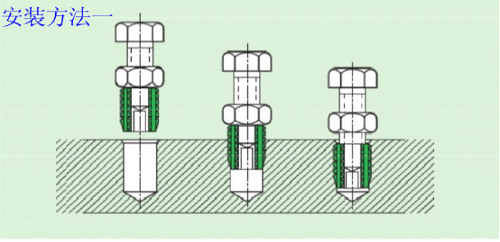方法一:當(dāng)安裝數(shù)量較少時, 可采取簡 易安裝方法,具體就是采取對應(yīng)規(guī)格螺栓+螺母的方法,如下圖所示,將自攻螺套固定在對應(yīng)型號的螺絲上,用同型號螺母進行固定, 使三者成為一個整體,用扳手把螺套擰入底孔,后把螺絲退出即可。