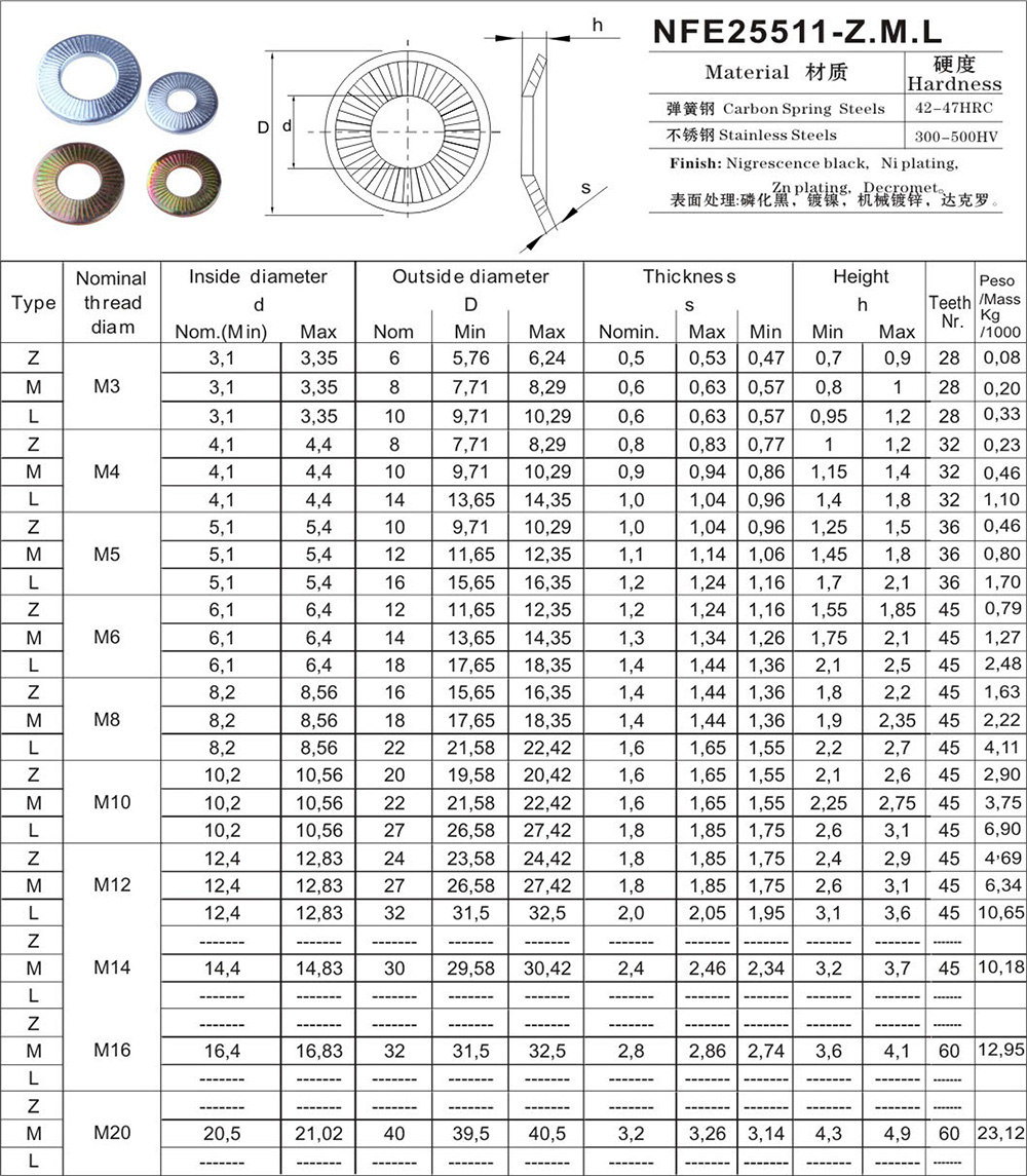法式鎖緊墊圈分標準型Z、加大型M、加寬型L、分別使用于頭部較小或較大的螺栓、接觸越大預緊力及鎖緊效果越好!