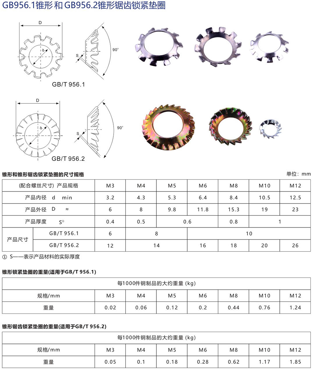 GB956.1外齒錐形鎖緊墊圈,GB956.2錐形鋸齒鎖緊墊圈,常用規(guī)格M3-M12備有現(xiàn)貨,也可根據(jù)客戶需求尺寸提供訂制。