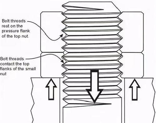 1、雙螺母雙螺母防松也稱對(duì)頂螺母防松,當(dāng)兩個(gè)對(duì)頂螺母擰緊后,兩個(gè)對(duì)頂?shù)穆菽钢g始終存在相互作用的壓力,兩螺母中有任何一個(gè)要轉(zhuǎn)動(dòng)都需要克服旋合螺紋之間的摩擦力。即使外載荷發(fā)生變化,對(duì)頂螺母之間的壓力也一直存在,因此可以起到放松作用。