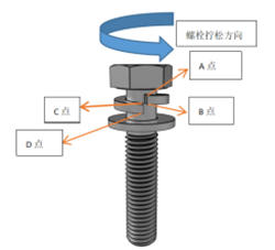 螺栓擰緊時(shí),螺栓頭部下承接面與擰緊方向同向壓迫A點(diǎn),平墊圈與擰緊方向同向順時(shí)針?lè)绞綁浩菵點(diǎn),最終使A點(diǎn)與C點(diǎn)、B點(diǎn)與D點(diǎn)保持在一個(gè)平面上。這時(shí),彈墊被壓平,說(shuō)明得到了彈墊施加在螺栓和平墊上的最大軸向力。