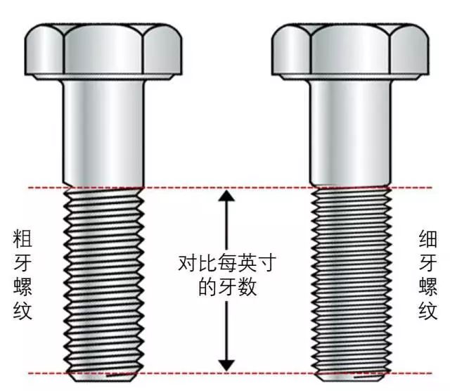 試問精細到何種程度的螺紋可以稱為細牙螺紋?我們不妨這樣來定義,所謂粗牙螺紋,可以定義為標(biāo)準螺紋;而細牙螺紋是相對粗牙而言的,在同一公稱直徑下,每英寸所含的牙數(shù)不同,也就是螺距不同,粗牙螺距大,而細牙螺距小。也就是說,對于1/2-13和1/2-20兩種規(guī)格來說,前者就是粗牙而后者就是細牙。因此表示為1/2-13UNC和1/2-20UNF。