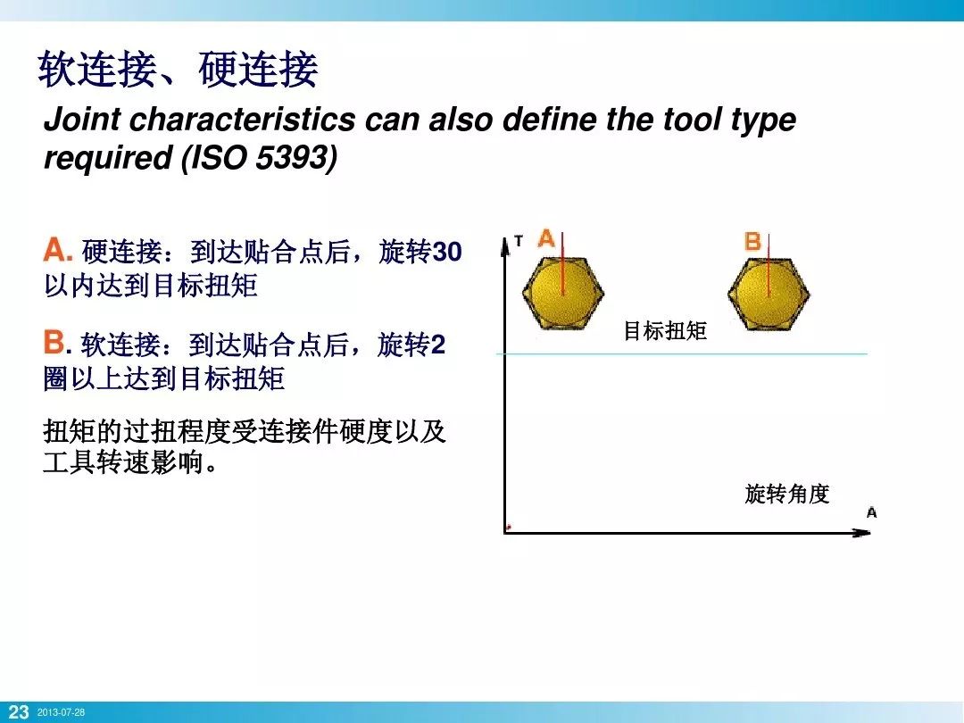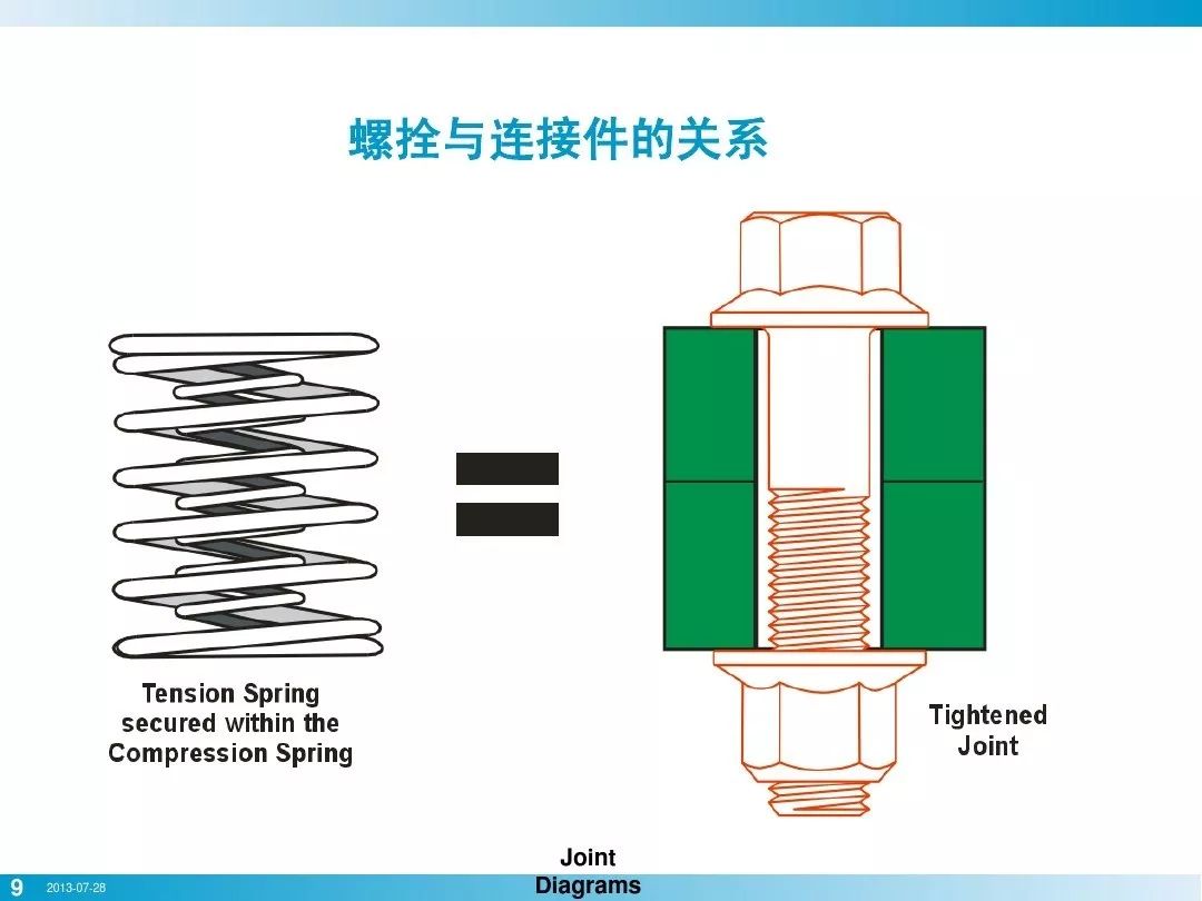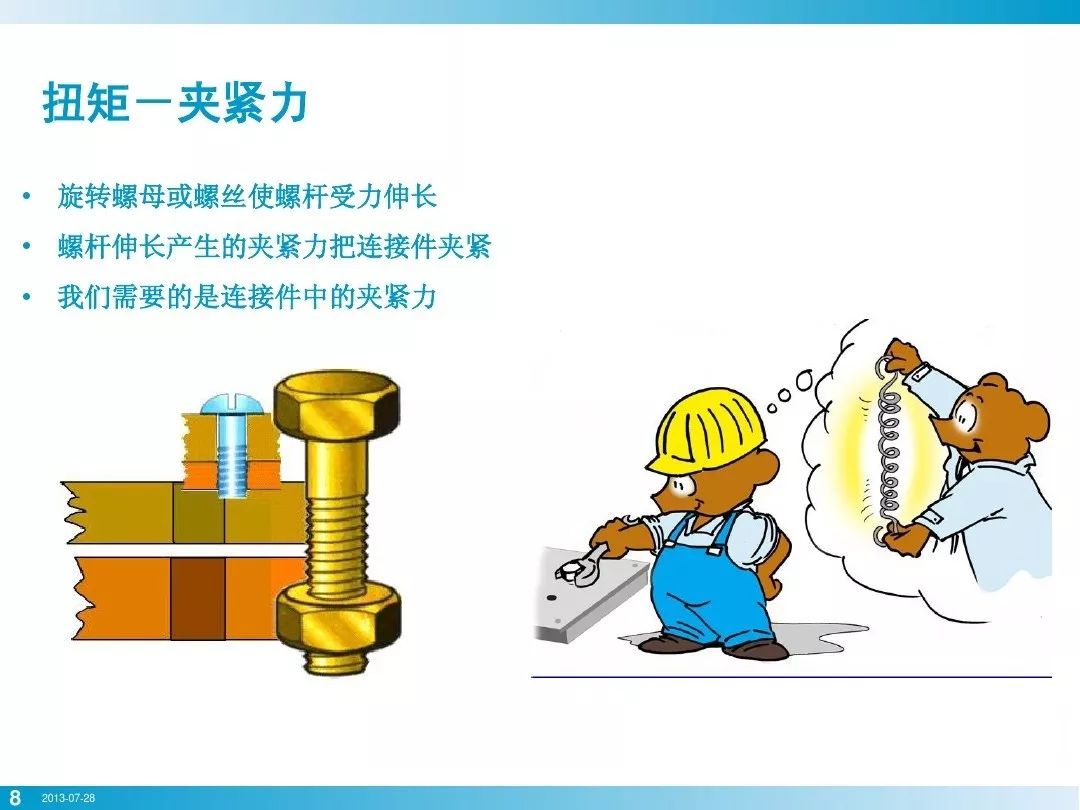螺栓:機(jī)械零件,配用螺母的圓柱形帶螺紋的緊固件。由頭部和螺桿(帶有外螺紋的圓柱體)兩部分組成的一類緊固件,需與螺母配合,用于緊固連接兩個(gè)帶有通孔的零件。這種連接形式稱螺栓連接。如把螺母從螺栓上旋下,又可以使這兩個(gè)零件分開(kāi),故螺栓連接是屬于可拆卸連接。下面我們就來(lái)講講,關(guān)于螺栓擰緊技術(shù)!擰緊一顆螺栓,需要施加一定扭矩旋轉(zhuǎn)一定角度后才可以完成,這部分的扭矩+角度所做功最終轉(zhuǎn)為三個(gè)部分:? Fm= T/ (0.16P + (μg * 0.58 * d2) + ((Dkm/2) * μk))μg = 螺紋副摩擦系數(shù)friction value in threadDkm = 螺栓頭表面尺寸 size of surface bolt (nut)-headμk = 螺栓頭表面摩擦系數(shù)fricition value surface bolt-head一般而言,這三者的比例在10%,40%以及50%,這部分能量的消耗很容易直觀的體會(huì)到:10%的夾緊力做功體現(xiàn)在螺栓的被拉伸,40%和50%體現(xiàn)了螺紋副以及螺栓頭下擰緊后摩擦力導(dǎo)致的發(fā)熱。螺栓的初始設(shè)計(jì)是按照如上圖的比例來(lái)分配三者關(guān)系的,如果實(shí)際的過(guò)程中改變了三者的比例關(guān)系,會(huì)出現(xiàn)扭矩“合格”,夾緊力不合格的情況。此時(shí)螺紋副摩擦系數(shù)降低,摩擦力矩變小,施加的扭矩“轉(zhuǎn)移”給夾緊力,后果有可能是:螺栓拉斷或者工件變形。此時(shí)螺紋副摩擦系數(shù)增加,有可能扭矩合格后夾緊力不足。其它改變摩擦系數(shù)的常見(jiàn)情況有:涂層材料改變,涂層厚度變化,螺栓/螺釘公差,與螺帽旋轉(zhuǎn)接觸面摩擦系數(shù),工具轉(zhuǎn)速,墊片增加/減少等。螺栓擰緊是裝配環(huán)節(jié)的重要環(huán)節(jié),螺栓/螺母在產(chǎn)品壽命周期內(nèi)必須穩(wěn)定連接,否則有可能造成嚴(yán)重的質(zhì)量事故,因?yàn)槁菟?螺母失效而導(dǎo)致的安全事故時(shí)有發(fā)生。螺栓常見(jiàn)強(qiáng)度等級(jí)如下,如果螺栓制造商供應(yīng)的螺栓不能滿足對(duì)應(yīng)的強(qiáng)度要求,螺栓連接的安全性也無(wú)法得到保障。按照ISO898要求,與螺栓配合的螺紋副/螺母強(qiáng)度要與螺栓本身強(qiáng)度相匹配,比如螺栓強(qiáng)度為10.9的螺栓,應(yīng)采用強(qiáng)度為10的螺母。同樣根據(jù)ISO898要求,螺母或者有效螺紋連接高度一般大于公稱直徑D的0.8以上,比如M10的螺栓與之匹配的螺母高度不得低于8mm。螺栓/螺母機(jī)械強(qiáng)度測(cè)試螺栓/螺母機(jī)械強(qiáng)度的測(cè)試方法很多,比較權(quán)威的方法是依據(jù)ISO898-1以及ISO898-2,對(duì)于螺栓的機(jī)械抗拉強(qiáng)度測(cè)試方法如下:固定螺栓兩端,通過(guò)萬(wàn)能材料試驗(yàn)機(jī)產(chǎn)生軸向拉力,通過(guò)軸向拉力/軸向拉伸量獲得螺栓的機(jī)械性能指標(biāo)。螺母/螺紋副的機(jī)械強(qiáng)度測(cè)試,如下圖示意:1. 實(shí)驗(yàn)載荷一般在抗拉強(qiáng)度的88%-94%之間4. 15S后手動(dòng)可以將螺紋旋出,則表示螺母/螺紋副強(qiáng)度合格