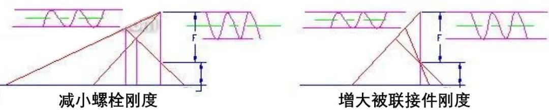 螺栓的最大應(yīng)力一定時(shí),應(yīng)力幅越小,疲勞強(qiáng)度越高。在工作載荷和剩余預(yù)緊力不變的情況下,減小螺栓剛度或增大被聯(lián)接件的剛度都能達(dá)到減小應(yīng)力幅的目的(見圖 5),但預(yù)緊力則應(yīng)增大。